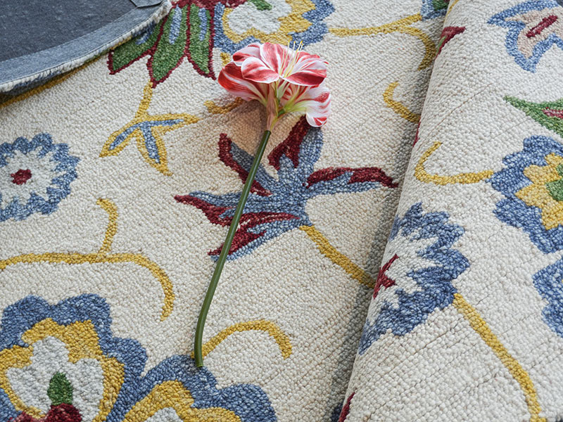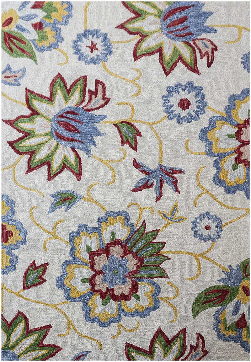Set against a soft ivory base, the design highlights tones of sky blue, deep red, leaf green, and warm yellow accents. The loop pile construction enhances the crisp outlines and layered detailing, offering long-lasting durability while maintaining a refined handcrafted texture.