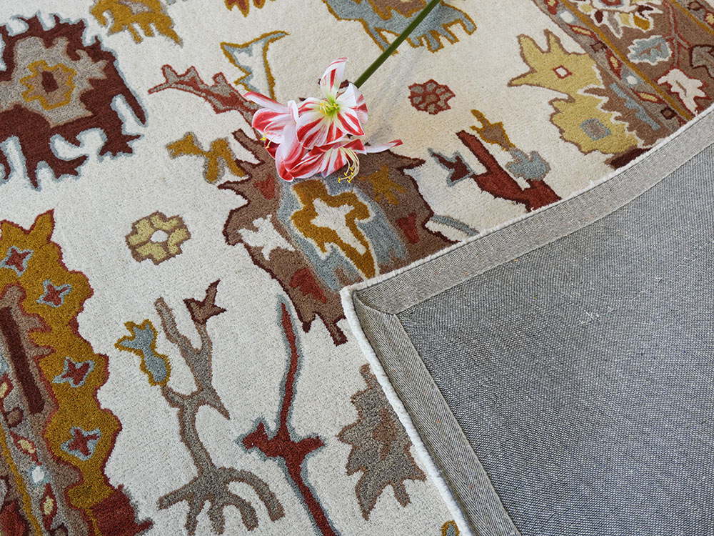 Ivory Heirloom draws inspiration from classical botanical rugs, interpreted with warmth and quiet sophistication. Hand-tufted in a 5×8 ft cut pile with a plush 10-mm height, the rug features an ivory ground layered with expressive floral motifs in tones of ochre, terracotta, muted rust, soft sage, and gentle greys. The richly detailed border frames the composition beautifully, lending structure and a sense of timeless balance.